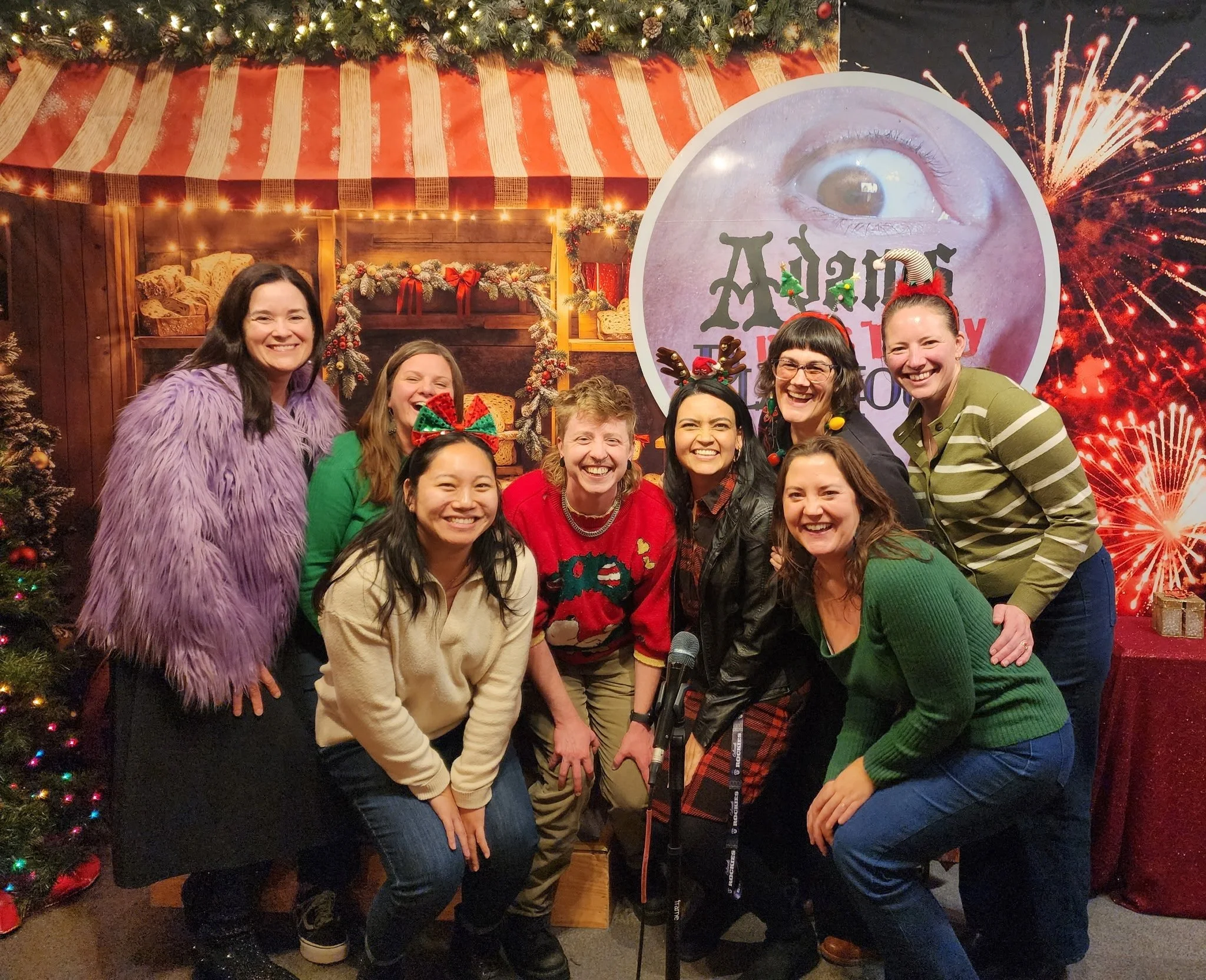A picture of eight of our Colorado team members in festive gear at our annual holiday party